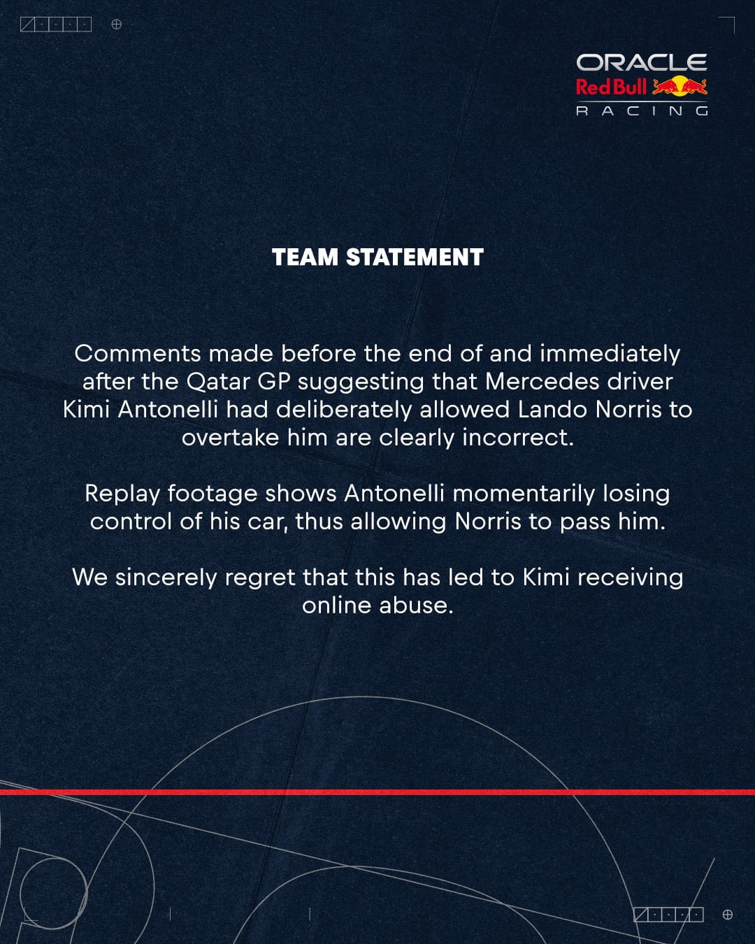 Em seu comunicado, a Red Bull afirmou: “Comentários feitos antes do final e imediatamente após o GP do Catar sugerindo que o piloto da Mercedes Kimi Antonelli havia deliberadamente permitido que Lando Norris o ultrapassasse são claramente incorretos”. A equipe prosseguiu explicando que “o replay da filmagem mostra Antonelli perdendo momentaneamente o controle de seu carro, o que permitiu que Norris o ultrapassasse”.